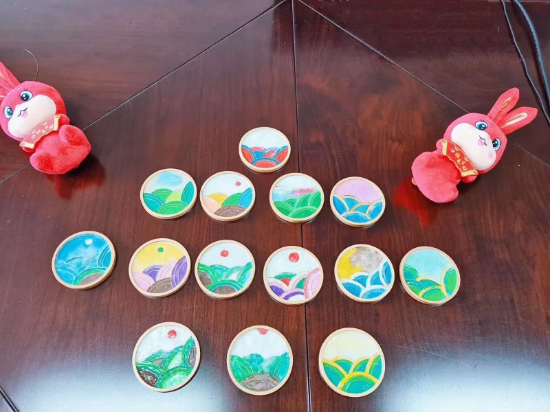 課上,單文靜詳細介紹了掐絲琺瑯彩畫的歷史淵源、發(fā)展歷程和工藝流程,并現(xiàn)場教授創(chuàng)作技巧和色彩搭配,培養(yǎng)大家對琺瑯彩畫藝術的審美情趣。在場人員聚精會神地傾聽、觀看,相互討論交流。隨后,在老師的指導下,大家用自己的巧手和智慧,按照“掐絲-洗沙-點彩”的步驟,制作出了一個個極具個性、各具韻味的掐絲琺瑯畫杯墊。