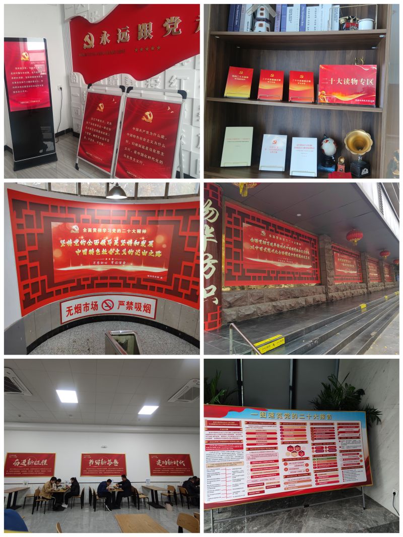 為深入學習宣傳貫徹黨的二十大精神,公司各所屬黨支部全方位營造濃厚學習氛圍:在電梯口、文化走廊、職工食堂等場所懸掛二十大精神金句宣傳展板及橫幅;在休息區(qū)增設二十大圖書角,放置二十大精神學習圖書及相關(guān)輔導讀本;利用電子屏幕滾動播放二十大精神金句圖片,在職工食堂用電視播放中國共產(chǎn)黨國際形象網(wǎng)宣片、二十大微視頻等,讓大家“抬頭看得見、隨處可以學、時時能感受”,積極營造出了全面貫徹學習黨的二十大精神的濃厚學習氛圍,引導全體黨員干部職工在學習中明方向,在感悟中找坐標,全方位、多角度地宣貫二十大精神影響力。