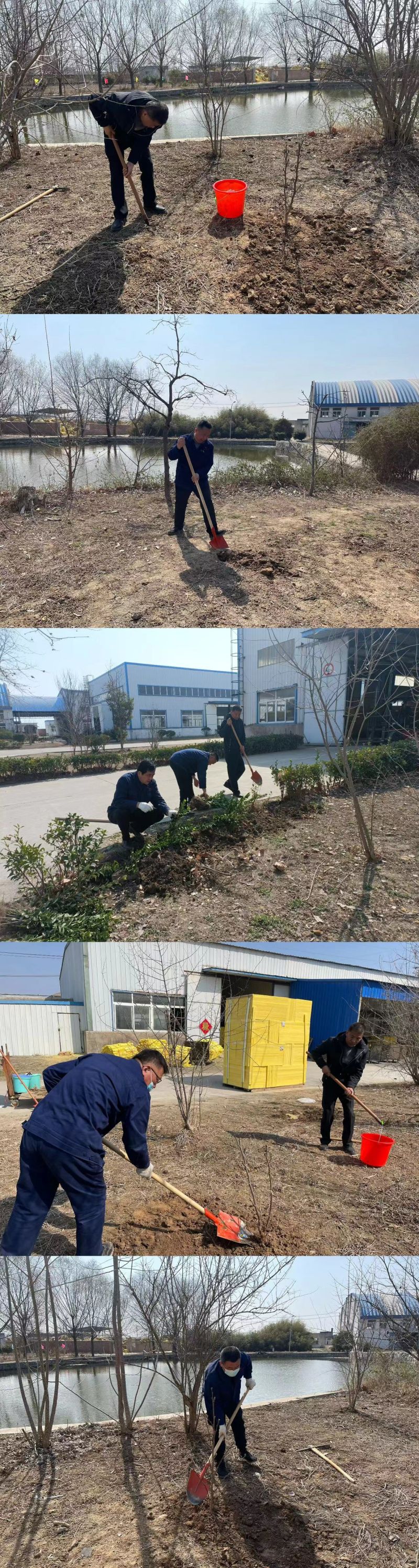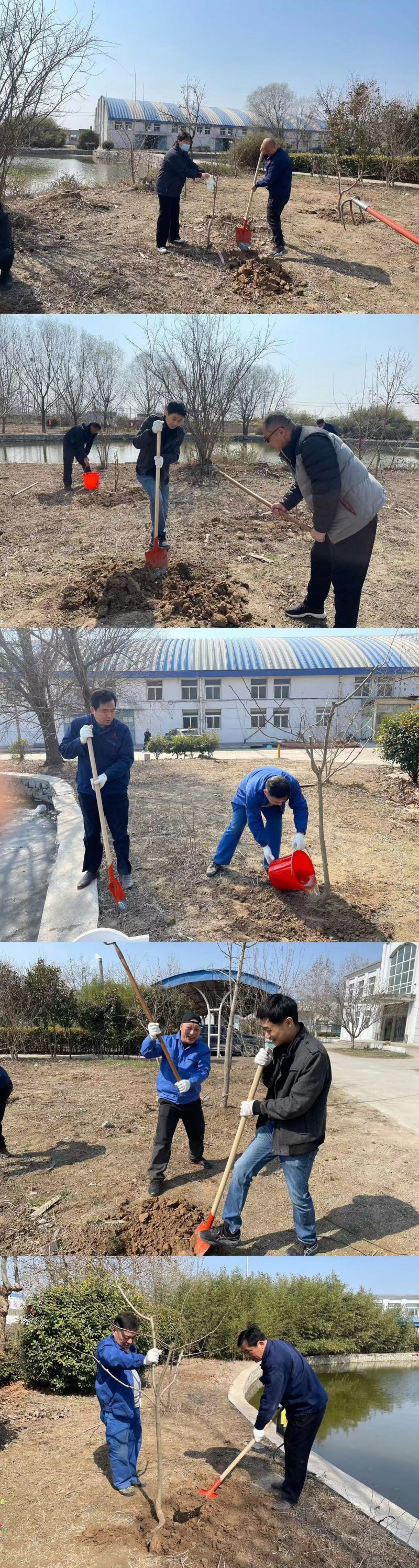 活動(dòng)現(xiàn)場(chǎng),大家擼起袖子,拿起鐵鍬、鋤頭等工具,個(gè)個(gè)熱情洋溢、干勁十足,一派緊張有序的勞動(dòng)景象。他們?nèi)迦艘唤M,分工明確,團(tuán)結(jié)協(xié)作,不一會(huì)兒,空地上挖出了一個(gè)個(gè)樹坑,接著把樹苗放到坑里,一邊扶著樹苗,一邊鏟土填坑,待樹苗基本能保持平衡豎立,才松開樹身,最后提水澆苗,培上一層干土,整個(gè)過程一絲不茍,各個(gè)環(huán)節(jié)銜接有序、配合默契,確保每一棵樹苗都能成活。經(jīng)過一上午熱火朝天的勞動(dòng),新種植的30余顆花果樹、百株冬青,在春日里迎風(fēng)挺立,展現(xiàn)出盎然生機(jī)。