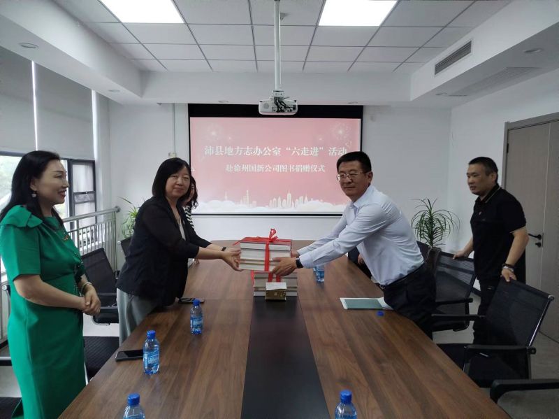 會上,徐州國新公司主要負責(zé)人介紹了徐州國新公司近期發(fā)展情況??h志辦向國新公司捐贈書柜2個,圖書10余種,共計100余冊。捐贈圖書均為地方志文獻類書籍,內(nèi)容涵蓋沛縣政治、歷史、地理、人物等多個領(lǐng)域。