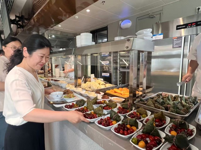 次日中午,集團工會在員工餐廳精心準備了色彩繽紛的水果拼盤、香甜軟糯的蜜棗粽子,為集團員工送上節(jié)日祝福。大家圍坐在一起,一邊分享昨日包粽的趣事,一邊品嘗蜜粽鮮果,食堂里洋溢著歡聲笑語。