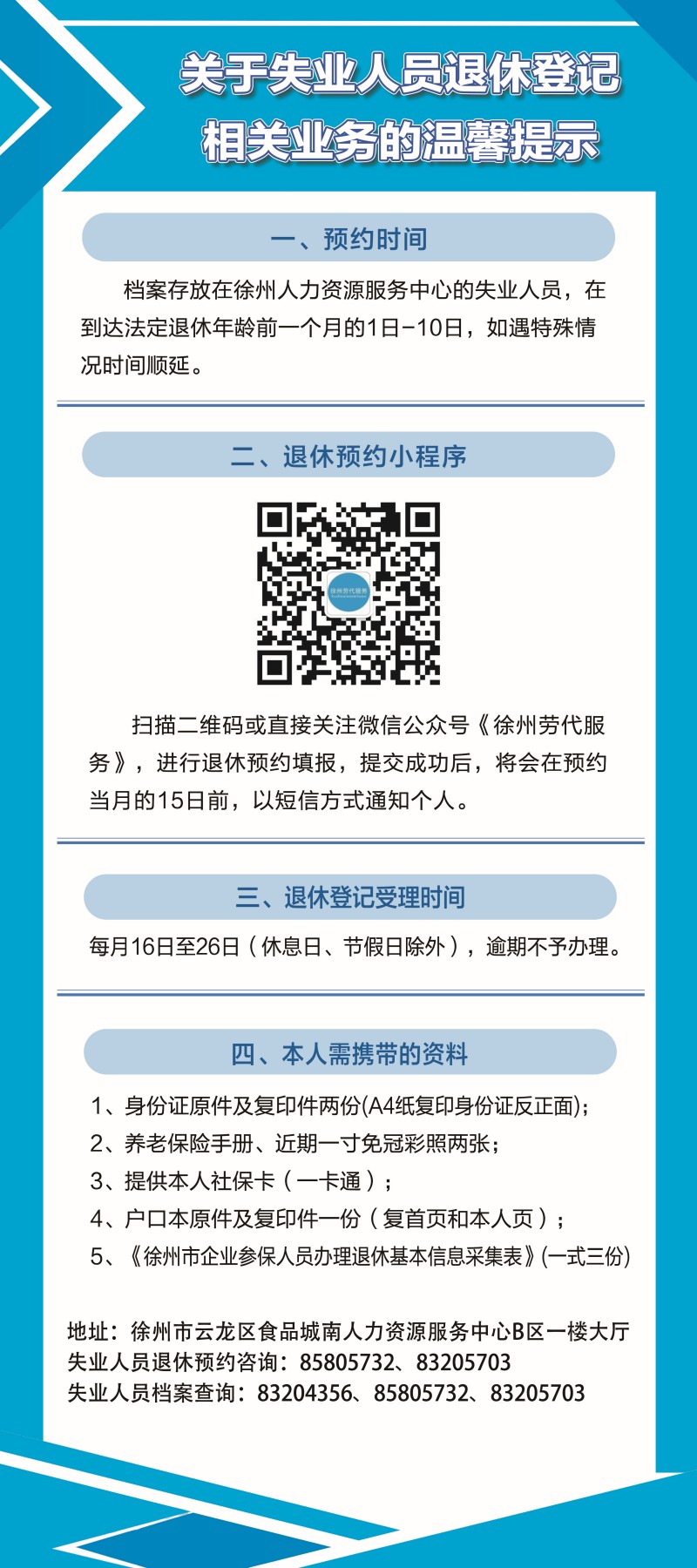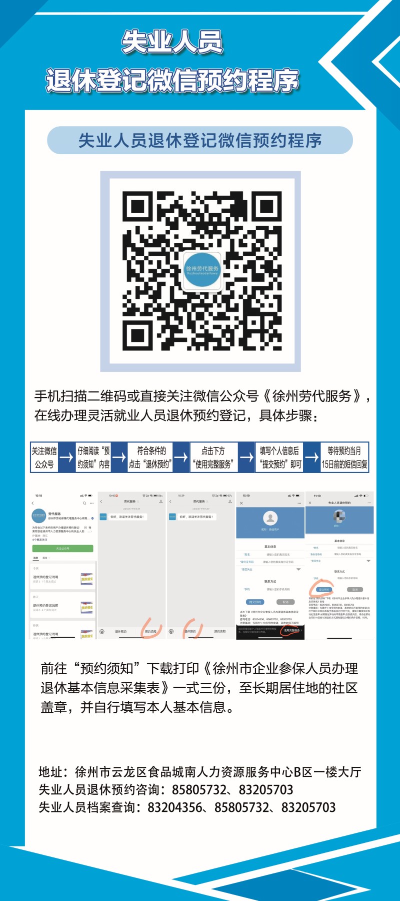 自3月1日起,凡符合以下兩個(gè)條件的退休人員,只需在到達(dá)法定退休年齡前一個(gè)月的10日內(nèi),關(guān)注微信公眾號(hào)“勞代服務(wù)”,即可辦理預(yù)約登記:(1)檔案存放在徐州市人力資源服務(wù)中心的失業(yè)人員;(2)未參加過工作,異地戶口以個(gè)體繳納徐州市本市養(yǎng)老保險(xiǎn)的純個(gè)體人員。