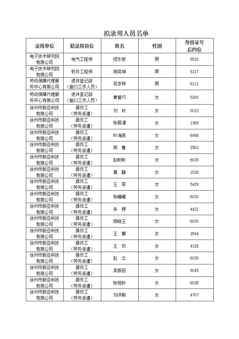 根據(jù)《徐州市國(guó)有資產(chǎn)投資經(jīng)營(yíng)集團(tuán)有限公司招聘工作人員公告》相關(guān)要求,海鷗集團(tuán)所屬電子技術(shù)研究院有限公司、勞動(dòng)保障代理服務(wù)中心有限公司、徐州市新亞科技有限公司公開(kāi)招聘工作已經(jīng)完成,現(xiàn)將擬錄用人員名單進(jìn)行公示。公示期自2023年5月6日起至5月11日止。如對(duì)公示對(duì)象錄用資格有異議,請(qǐng)于公示期內(nèi)向海鷗集團(tuán)組織人事部(紀(jì)檢監(jiān)察室)反映。