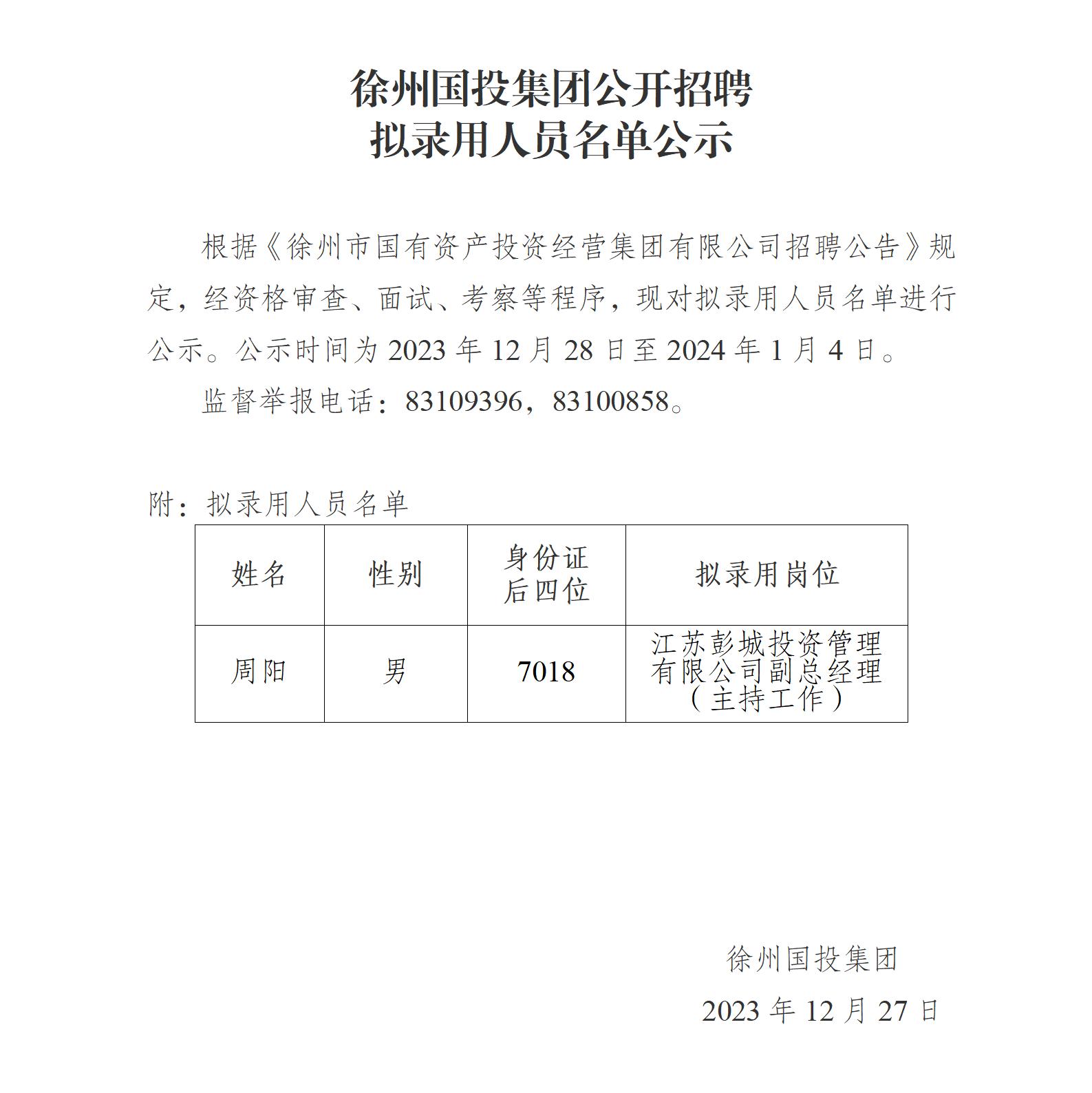 徐州國投集團(tuán)公開招聘擬錄用人員名單公示