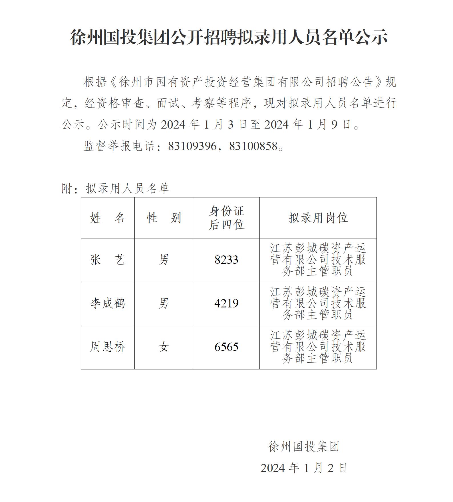 徐州國投集團內(nèi)部招聘工作人員擬錄用人員名單公示
