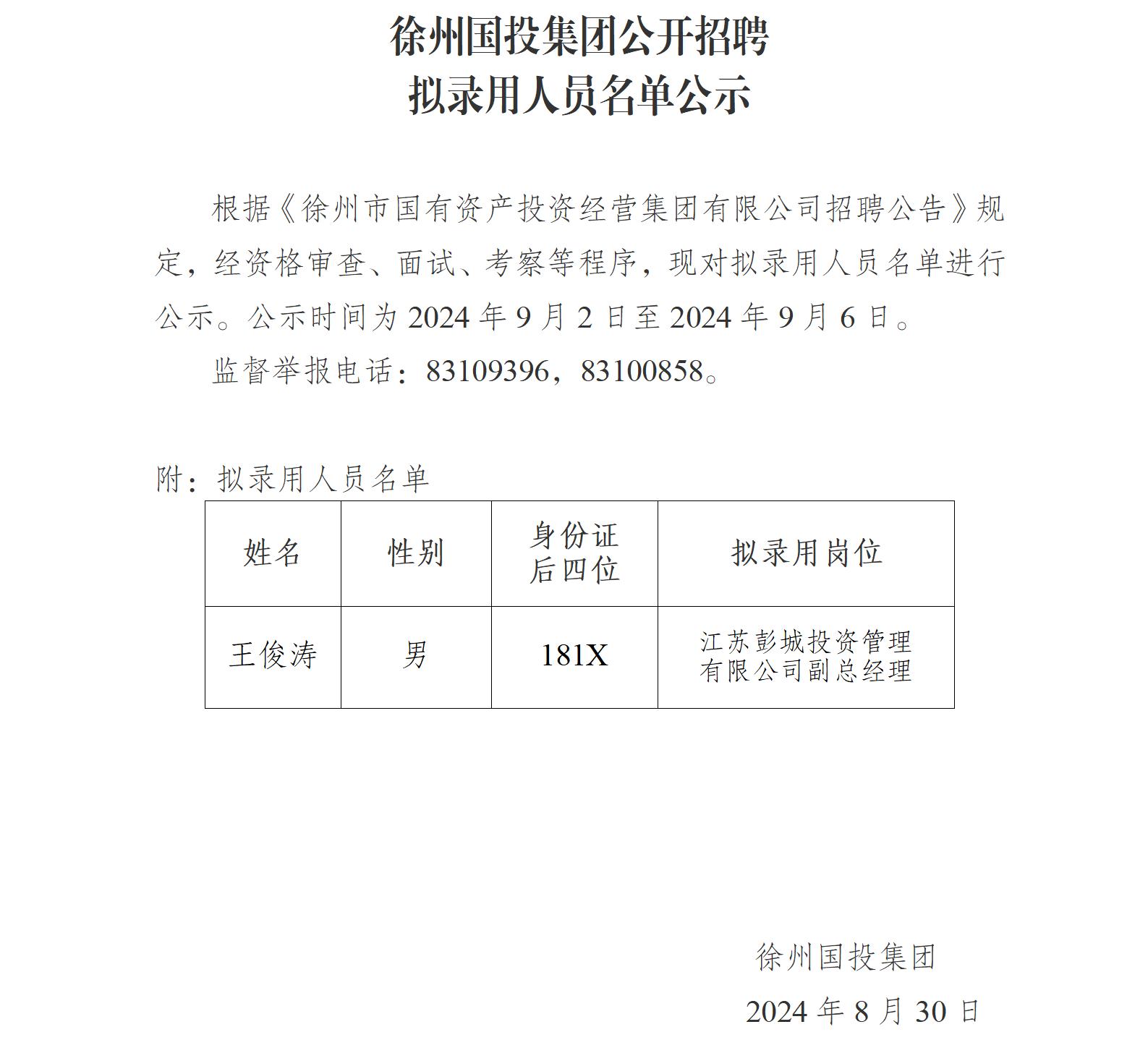 徐州國投集團(tuán)內(nèi)部招聘工作人員擬錄用人員名單公示