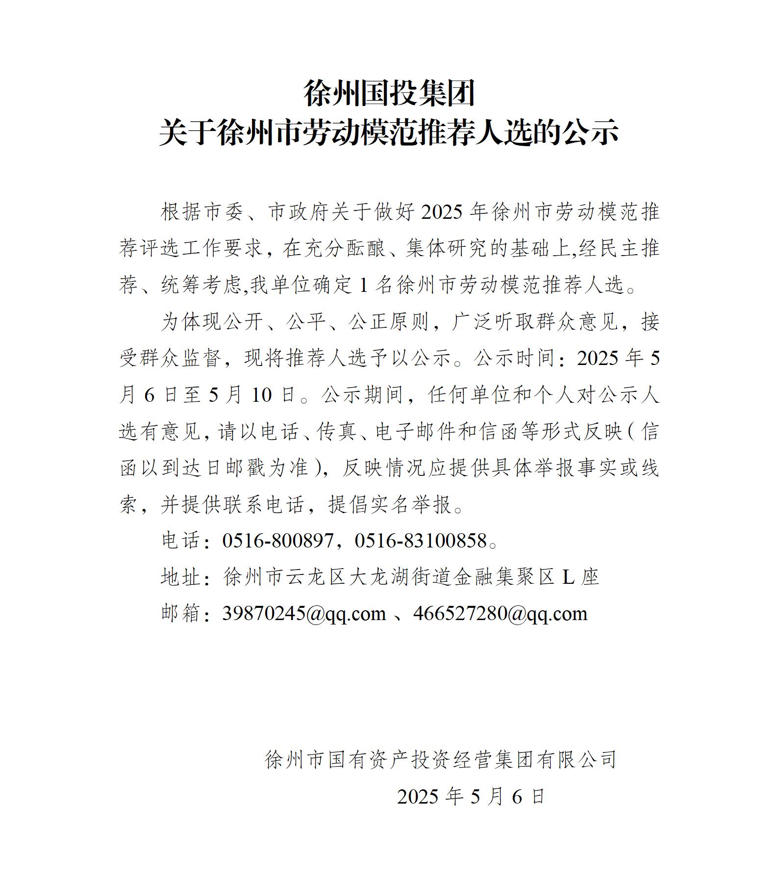 徐州國投集團關(guān)于徐州市勞動模范推薦人選的公示