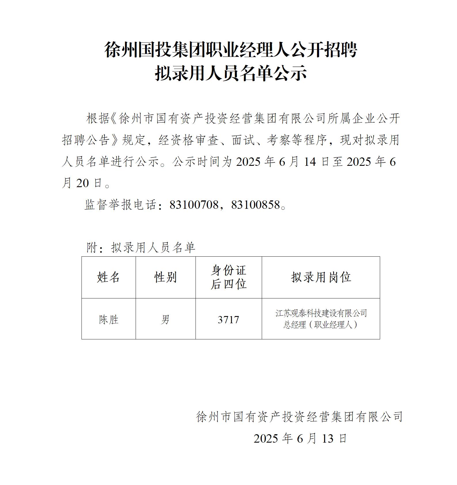 徐州國(guó)投集團(tuán)內(nèi)部招聘工作人員擬錄用人員名單公示