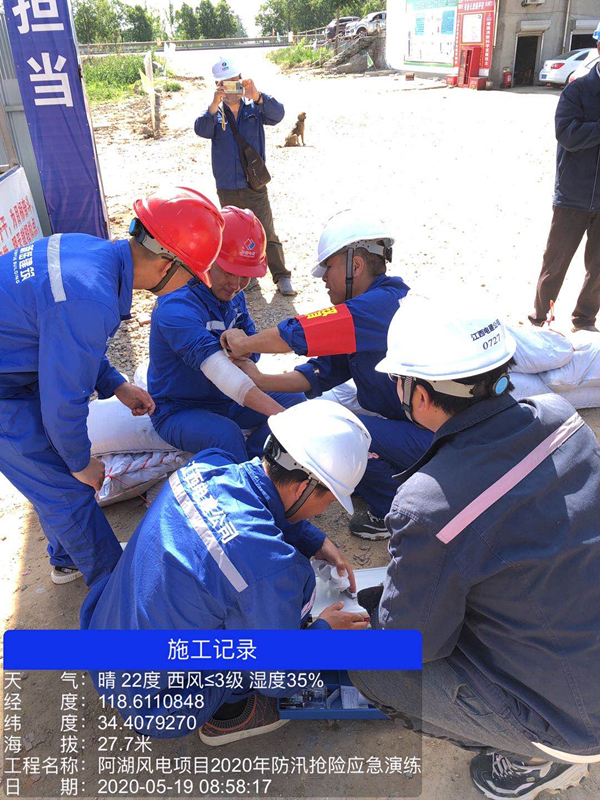 擬定5月19日上午9時,新沂市阿湖鎮(zhèn)區(qū)域突發(fā)局部強降雨,導致升壓站施工區(qū)洪水爆發(fā),升壓站值勤人員立刻向現(xiàn)場值班領(lǐng)導及防汛總指揮報告??傊笓]接到報告后,立刻啟動應(yīng)急預案。搶險救援隊集合完畢,分為兩隊進行搶險救災,第一隊搶救重要物資,轉(zhuǎn)移至高地,另一隊組織突擊隊員用沙袋在升壓站門口堆砌擋水墻,阻斷洪水進入,同時組織裝載機、推土機修復便道,恢復交通,保證撤離路線暢通。上午11時洪水退卻,各小組清點人數(shù)后向指揮部報告,除一名傷員送往醫(yī)院外(演練設(shè)定),全部人員安全在場,演練取得圓滿成功。