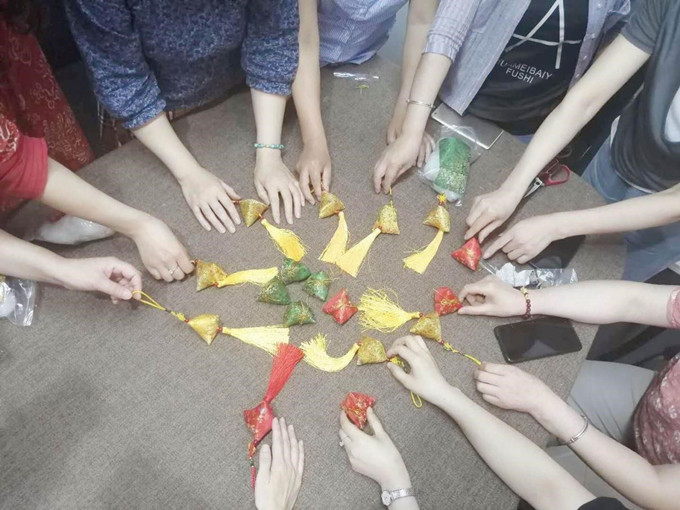 隨后,劉紅老師將精心準(zhǔn)備好的布料、針線、香料等材料分發(fā)給大家,手工體驗(yàn)即刻開始,劉紅老師邊耐心的講解香棕的制作技巧,邊手把手教大家如何縫制,整個(gè)制作過程洋溢著濃濃的溫情………一個(gè)個(gè)制作好的香包匯聚在一起,五顏六色,精美別致,還散發(fā)著撲鼻的香包那特有的味道,大家在親自體驗(yàn)手工勞動(dòng)和樂趣的同時(shí)進(jìn)一步對中華民族的傳統(tǒng)文化產(chǎn)生了濃厚的興趣。
