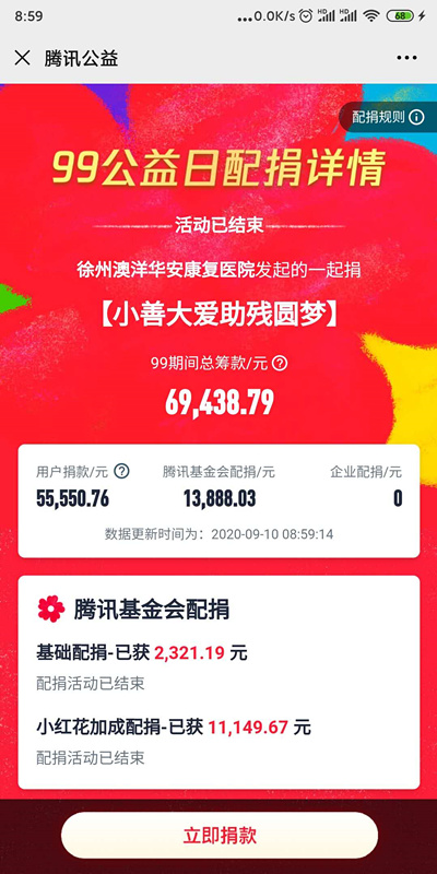 國泰投資所屬各單位積極響應(yīng)“99公益日”活動(dòng)號召,認(rèn)真研究配捐集小紅花獲取配捐活動(dòng)規(guī)則,力求最大程度獲得騰訊公益平臺(tái)的配捐額度?;顒?dòng)以澳洋華安醫(yī)院黨支部為發(fā)起單位、全體黨員干部職工為主力軍,組建了國泰投資先鋒隊(duì)等十余支愛心助捐團(tuán)隊(duì),分工明確、密切配合,集中在9月7、8、9日三天進(jìn)行募捐、點(diǎn)贊集小紅花獲取配捐。截止9月9日,共籌集善款(含配捐)69438.79元(其中國泰投資募集善款22112元)。