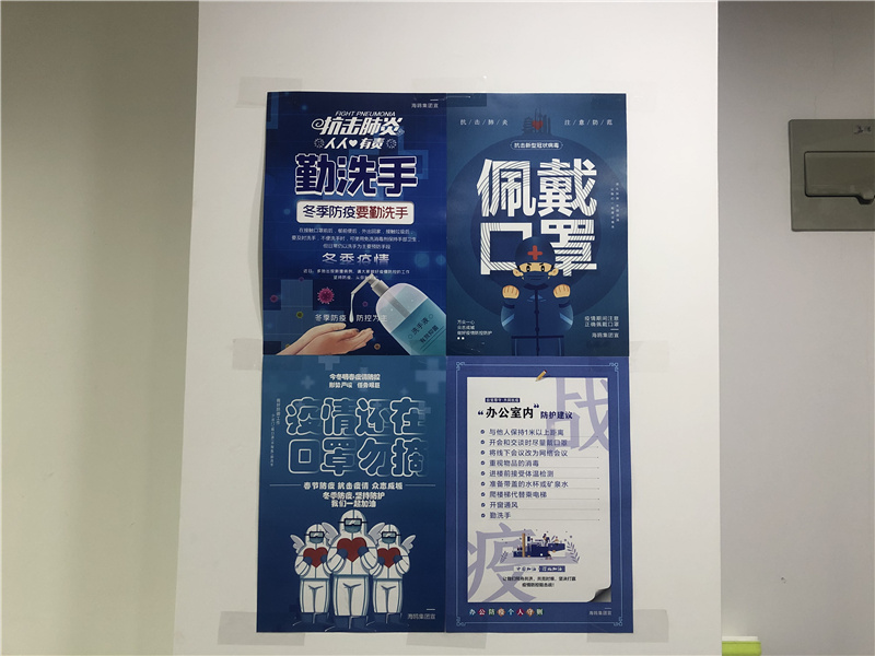 一是營造防疫氛圍。在辦公區(qū)域內(nèi)懸掛“抗擊疫情 從我做起”防疫宣傳條幅,精選“防護(hù)建議”等防疫海報張貼在顯著位置,宣傳疫情防控知識,提高職工對疫情防控的重視,嚴(yán)防冬季疫情反彈。