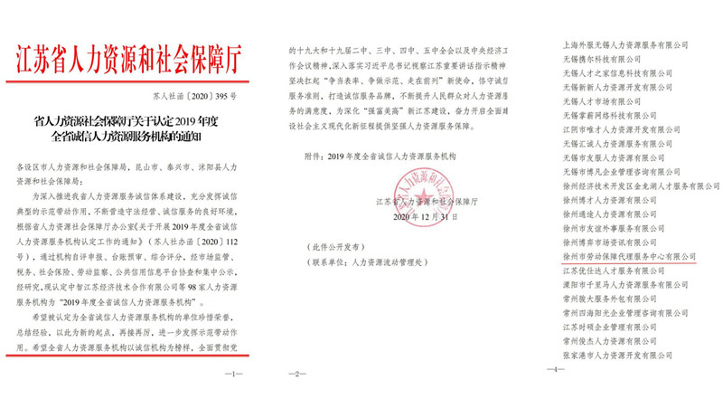 近日,江蘇省人力資源和社會保障廳公開發(fā)布《省人力資源社會保障廳關(guān)于認(rèn)定2019年度全省誠信人力資源服務(wù)機(jī)構(gòu)的通知》(蘇人社〔2020〕395號),徐州市勞動保障代理服務(wù)中心有限公司榜上有名。