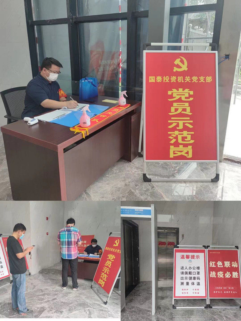 國泰投資公司在此次疫情防控中,獨(dú)立設(shè)置員工出入口,并在出入口設(shè)置疫情防控監(jiān)測(cè)點(diǎn),每天早上由“先鋒隊(duì)”黨員輪值,督促正確佩戴口罩,查看“兩碼”,測(cè)量體溫等,構(gòu)筑群防群治的嚴(yán)密防線。8月9日一早,黨總支書記霍凱同志以身作責(zé),作為先鋒隊(duì)第一個(gè)正式“上崗”的黨員走上防控監(jiān)測(cè)服務(wù)第一線。”