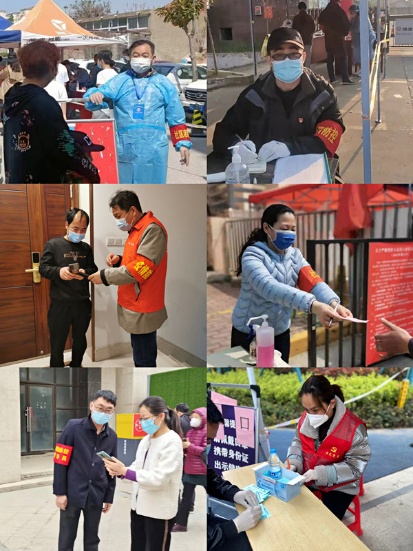 機(jī)關(guān)一支部書記陳杰帶領(lǐng)妻子和女兒一家三口齊上陣,全部都當(dāng)上抗疫志愿者;遠(yuǎn)大支部書記趙明芳既在北望小區(qū)廣場(chǎng)核酸檢測(cè)點(diǎn)協(xié)助做好體溫測(cè)量等工作,又兼顧做好“疫”后公司復(fù)工復(fù)產(chǎn)的工作部署;勞代支部副書記朱文華堅(jiān)守在徐州人家小區(qū)南門,當(dāng)好小區(qū)“守門員”;新亞支部書記陳航除每日做好最新通知傳達(dá)、工作安排以外,返徐家人“3+11”健康監(jiān)測(cè)期滿后,他就報(bào)名參加了山語(yǔ)世家核酸檢測(cè)點(diǎn)查驗(yàn)兩碼等工作;正大支部書記王艷在世茂天域華府檢測(cè)點(diǎn)認(rèn)真開(kāi)具核酸檢測(cè)證明。