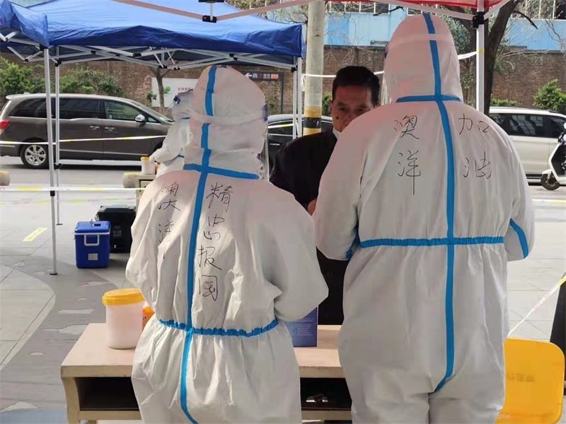 徐州澳洋華安康復(fù)醫(yī)院核酸檢測應(yīng)急分隊共50名團員參與此次核酸檢測任務(wù),團員們火速支援各個社區(qū),與社區(qū)志愿者們瞬間成為戰(zhàn)友,團支部副書記張毛妮說:“在這里,我們穿著防護服,帶著口罩、防護面屏、手套……密閉的防護衣悶熱的全身大汗淋漓,厚厚的手套使平時操作起來很簡單的動作變得困難,面罩和口罩給臉上留下了一道道印痕,一遍遍抬手臂胳膊酸疼,長時間的彎腰站立后腰背疼痛……但是看到市民們井然有序的排著隊伍,社區(qū)志愿者們熱心主動的幫忙,聽到完成采集的市民一句‘謝謝’,我們知道,我們的付出和辛苦是值得的?!笨箵粢咔椋嗄晗刃?,徐州澳洋華安康復(fù)醫(yī)院團支部高舉“聚是一團火,散是滿天星”的團結(jié)之炬,不畏艱苦、砥礪前行,為早日打贏這場疫情防控狙擊戰(zhàn)不斷奮斗著!