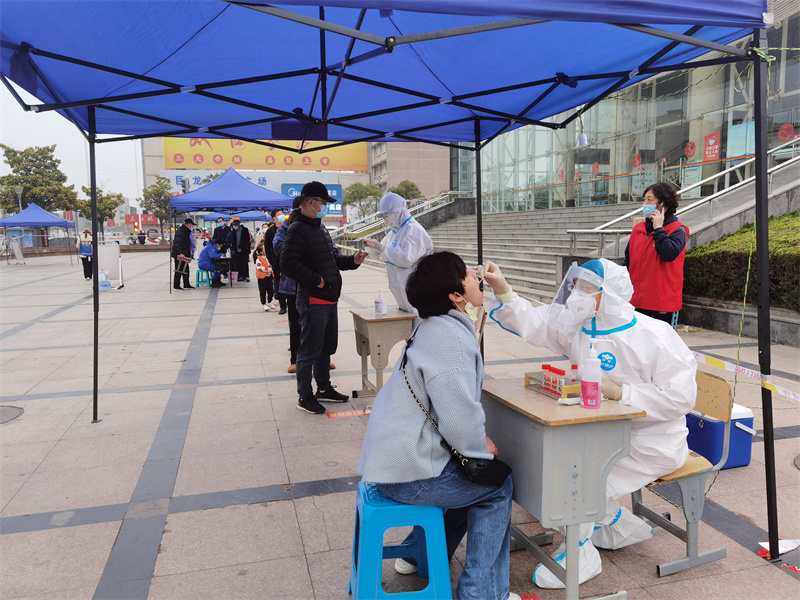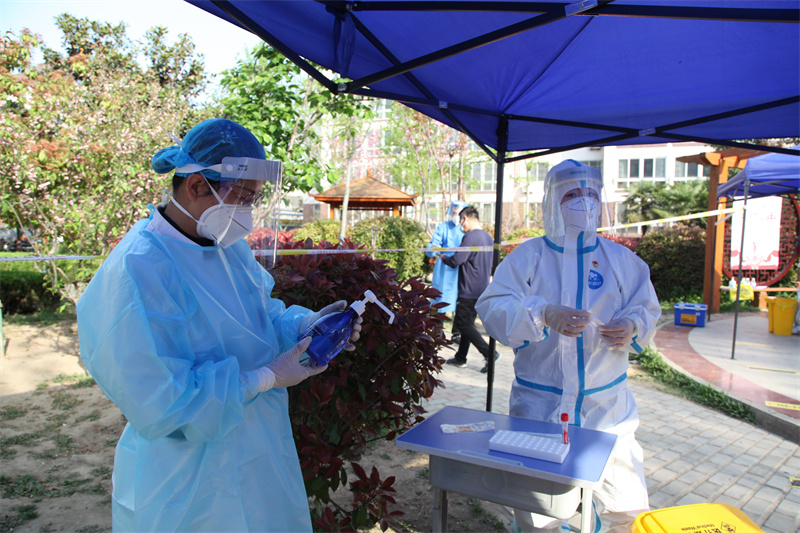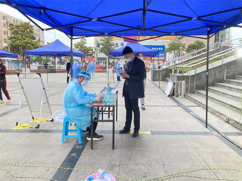 副院長張文權(quán)下班后沒有回家,來到所負(fù)責(zé)的采樣點,帶頭穿上防護(hù)服當(dāng)起了志愿者,為采樣居民進(jìn)行信息登記。