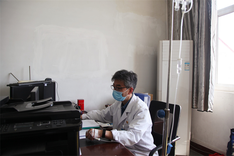 除了辛苦奮斗在采樣現(xiàn)場的人員,還有一位帶給大家感動的人,他就是防控辦副主任趙智勇。防控任務(wù)責(zé)任重大,事無巨細(xì)。自負(fù)責(zé)防控工作以來,他加班加點,付出了大量心血,晚上參加上級防控會議是家常便飯,會議開到凌晨一兩點鐘并不少見。身邊的同事評價他“趙老師是全年無休!”工作的緊張及辛苦,使他得了高血壓,這次全員核酸檢測時,他還在輸液治療中。為了不影響工作,他只能中午在辦公室一邊輸液,一邊聯(lián)絡(luò)協(xié)調(diào)采樣現(xiàn)場工作,并每小時一次對各采樣點報來的核酸采樣數(shù)據(jù)進(jìn)行匯總上報。