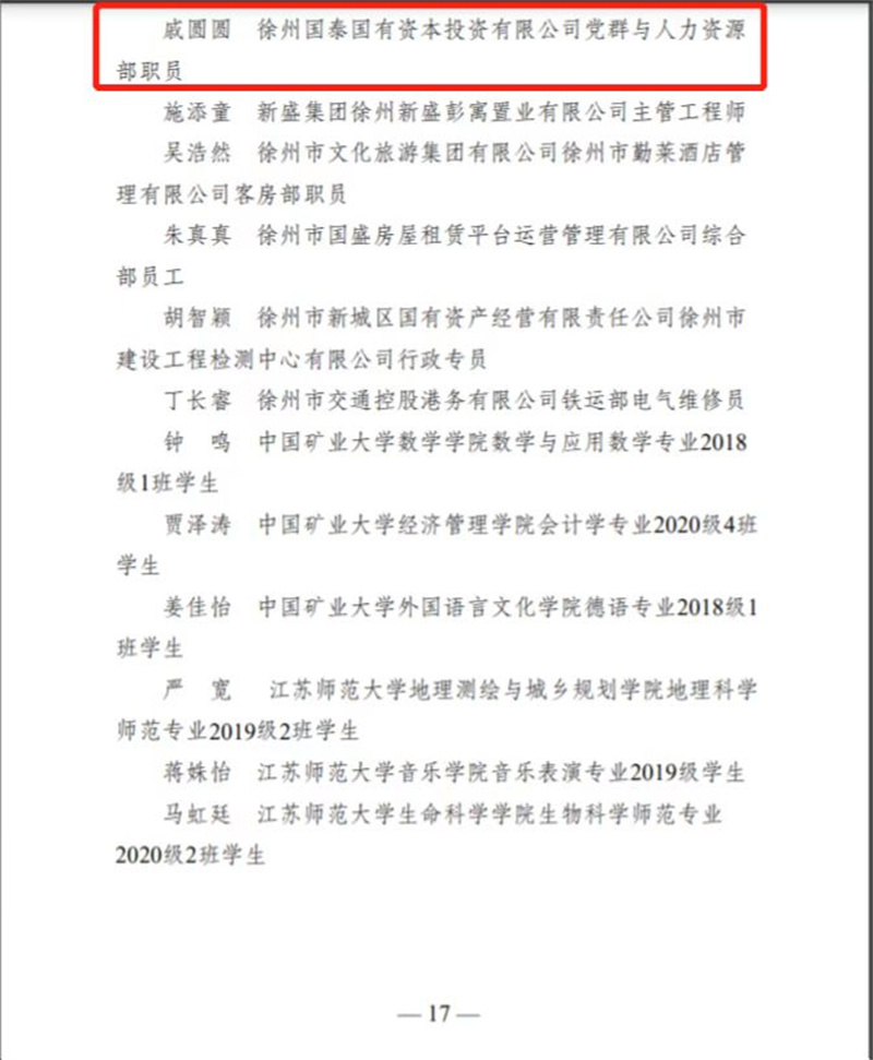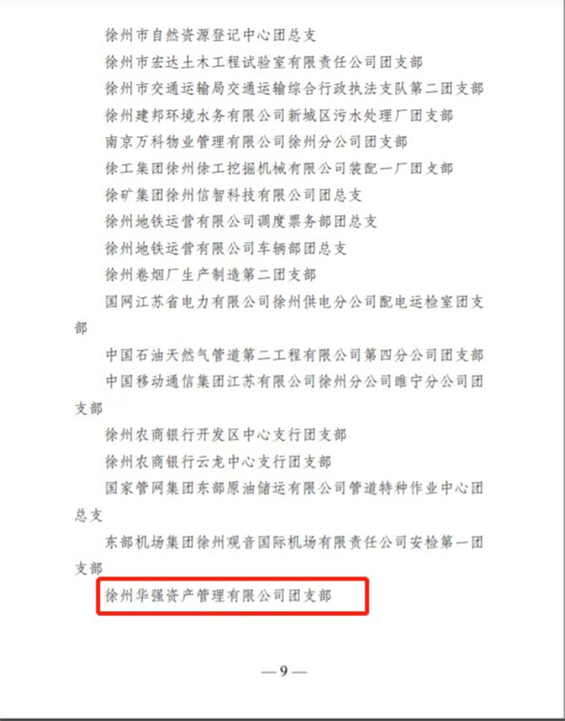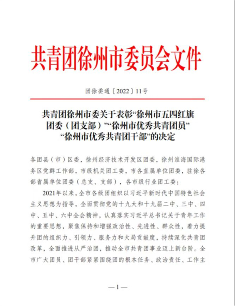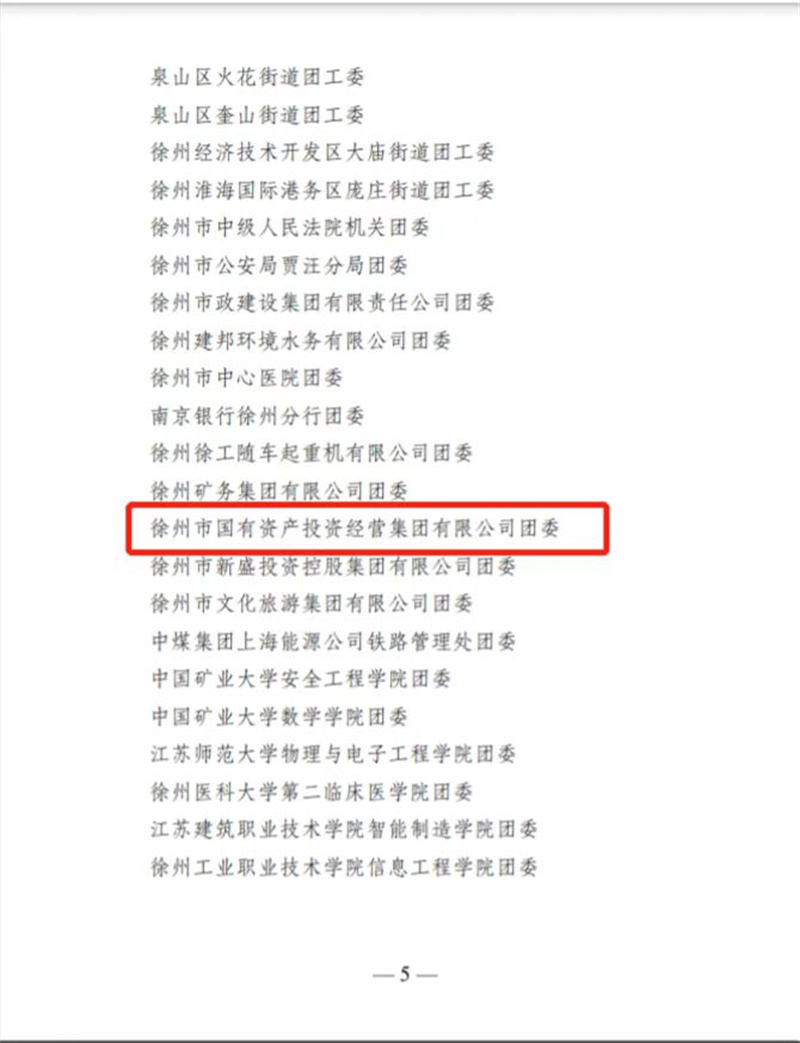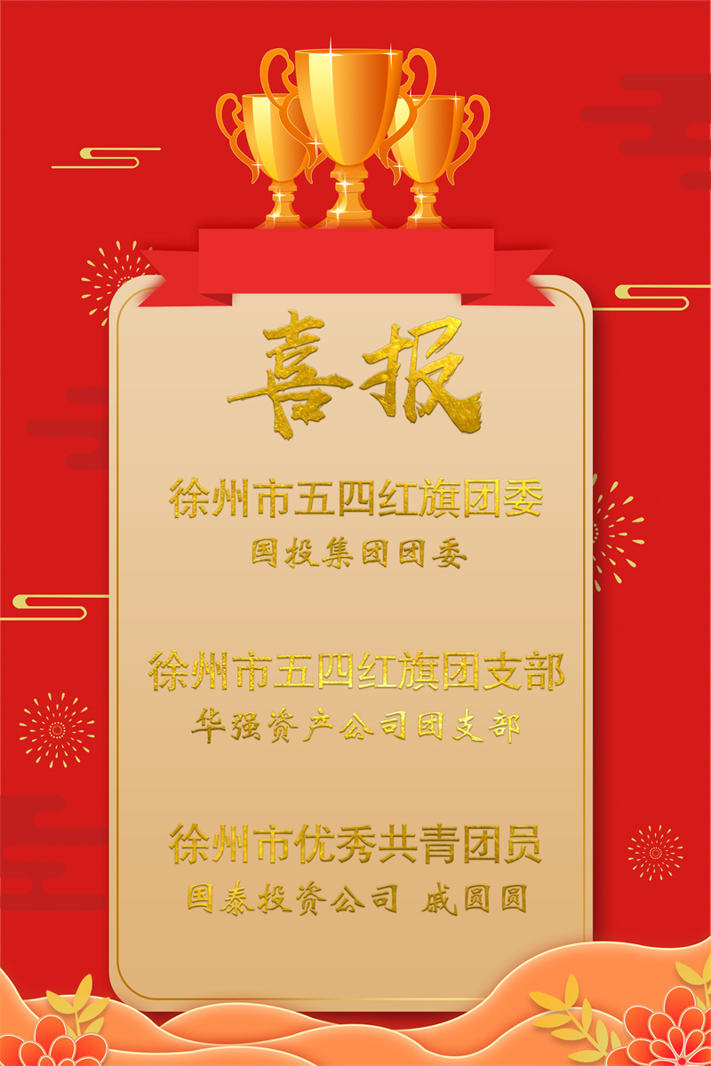 2022年是黨的二十大召開(kāi)之年,也是中國(guó)共青團(tuán)成立100周年。近日,共青團(tuán)徐州市委對(duì)各級(jí)團(tuán)組織及個(gè)人作出表彰。其中,國(guó)投集團(tuán)團(tuán)委榮獲“五四紅旗團(tuán)委”稱號(hào)、華強(qiáng)資產(chǎn)公司團(tuán)支部榮獲“五四紅旗團(tuán)支部”稱號(hào),國(guó)泰投資公司戚圓圓同志榮獲“優(yōu)秀共青團(tuán)員”稱號(hào)。