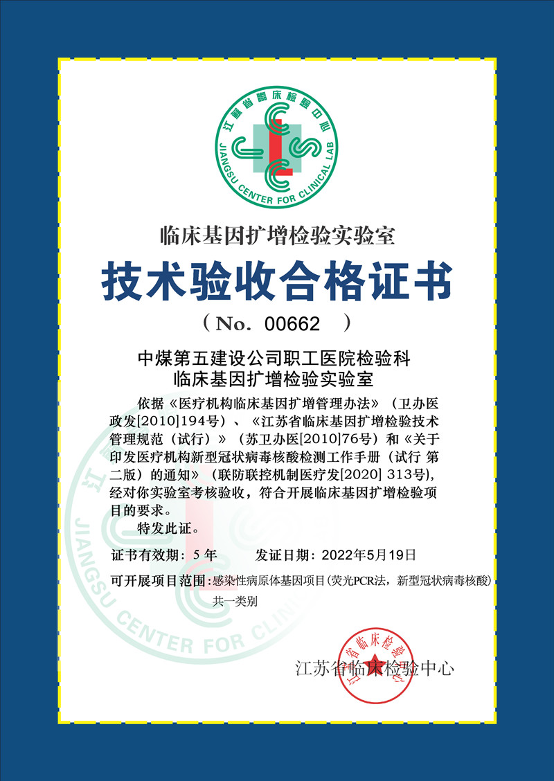 5月19日江蘇省臨床檢驗中心頒發(fā)了《中煤第五建設公司職工醫(yī)院檢驗科臨床基因擴增檢驗實驗室技術驗收合格證書》(NO 00662)。中煤五建職工醫(yī)院將以此為契機,抓住機遇,創(chuàng)新發(fā)展,圍繞“完善質(zhì)控體系、提升醫(yī)療質(zhì)量、加強學科建設”的目標,全方位做好醫(yī)院各項工作,實現(xiàn)醫(yī)院發(fā)展再邁一個新臺階。