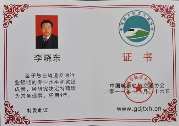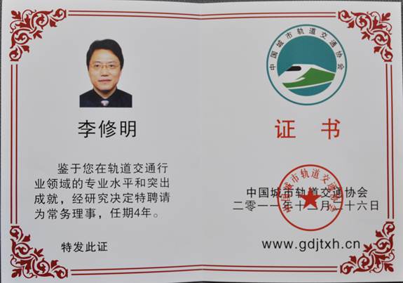 2011年12月26日,集團(tuán)公司正式獲批成為中國(guó)城市軌道交通協(xié)會(huì)常務(wù)理事單位,2012年1月4日集團(tuán)公司作為中國(guó)城市軌道交通協(xié)會(huì)常務(wù)理事單位正式掛牌開展工作。集團(tuán)公司黨委書記、董事長(zhǎng)李修明,黨委副書記、副董事長(zhǎng)、總經(jīng)理李曉東被中國(guó)城市軌道交通協(xié)會(huì)特聘為常務(wù)理事。