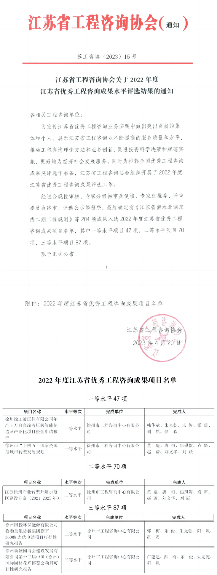為展示江蘇省工程咨詢業(yè)服務質量和水平,宣傳表彰在江蘇省優(yōu)秀工程咨詢業(yè)務實踐中做出突出貢獻的集體和個人,近日,江蘇省工程咨詢協(xié)會組織開展了2022年度江蘇省優(yōu)秀工程咨詢成果水平評選工作。集團公司所屬工程咨詢中心共有5項咨詢成果獲獎,其中一等水平2項,二等水平1項,三等水平2項。