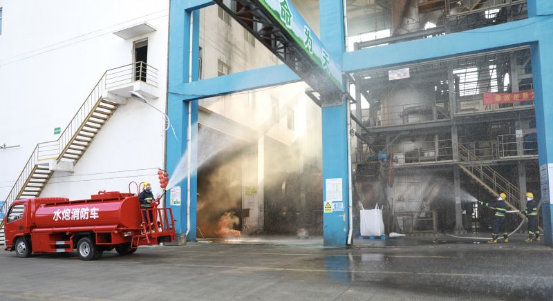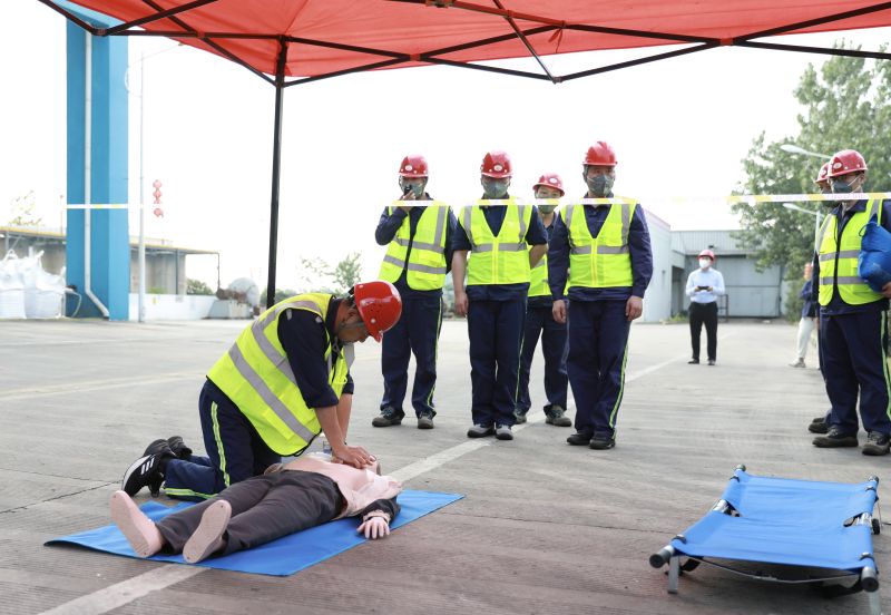 本次應(yīng)急演練活動現(xiàn)場位于危廢處置中心危險廢物焚燒車間,模擬場景設(shè)計為巡檢人員在更換窯頭噸桶廢液時,由于操作不當,回流管從收集桶中甩出至地面,廢液飛濺到巡檢人員額面部,造成灼傷。同時,廢液濺至回轉(zhuǎn)窯周邊遇熱燃燒,并點燃回流管不斷涌出的廢液。事故發(fā)生后,危廢中心應(yīng)急救援隊伍各司其職,消防與搶險救災(zāi)組使用滅火器、消火栓、消防水炮霧化滅火;警戒保衛(wèi)組對事故現(xiàn)場警戒;醫(yī)療救護組對受傷人員進行心肺復蘇急救,將受傷員工外送就醫(yī);環(huán)境保護組打開應(yīng)急水池閘門,做好消防水及洗消水的收集工作。通過各現(xiàn)場應(yīng)急救援組織機構(gòu)協(xié)同努力,緊急情況得以解除,現(xiàn)場經(jīng)洗消檢驗后恢復正常狀態(tài)。
