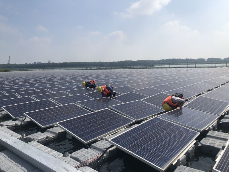 熱浪翻滾,淮北鑫能電站運(yùn)維人員正小心翼翼的在浮筒上穿行,檢查光伏組件MC4接頭是否有脫落。狹窄的浮筒通道上,他們或趴或坐在浮筒上,對(duì)破損的電纜通道浮筒和故障逆變器進(jìn)行更換。經(jīng)過猛烈的日光折射,水面上形成了一股熱氣,上烤下蒸的模式使得救生衣里面衣衫濕透,分不清是汗水還是湖水。