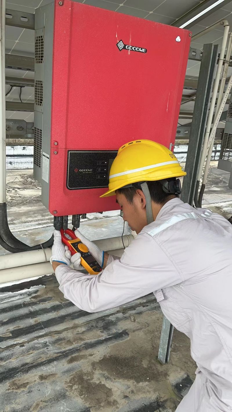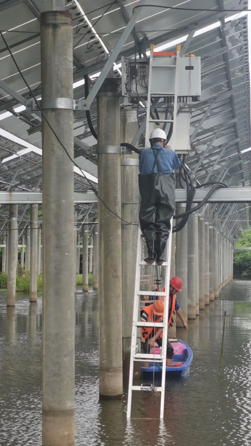太湖鑫能電站的光伏組件和逆變器安裝在距水面高度3米的支架上,日常運(yùn)維借助梯子和小船進(jìn)行,一旦發(fā)現(xiàn)逆變器故障,運(yùn)維人員只能腳踩淤泥站在齊腰深的水中,為高處作業(yè)的同伴扶穩(wěn)梯子,以便完成故障逆變器的更換。