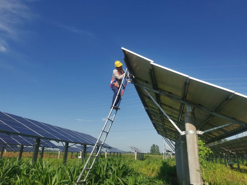 安徽區(qū)域的地面光伏場(chǎng)站較為分散,光伏區(qū)遍布茂密的農(nóng)作物或雜草,完成一次巡視需要大量的人力與時(shí)間。光伏板經(jīng)過烈日曬烤,散發(fā)陣陣熱浪,宿州協(xié)鑫、碭山協(xié)鑫、碭山鑫能電站的運(yùn)維人員剛剛開展一次登高作業(yè),在地面小伙伴的配合下,完成了對(duì)故障光伏組串的維修。熾熱的火傘高張?jiān)诳罩?,高處的風(fēng)并沒有送來涼爽的感覺,被暴曬過的支架盡管隔著工作服,仍能感受到它的炙熱。