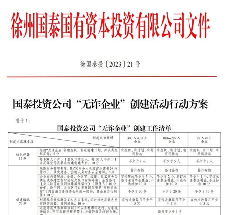 為順利推進“無詐企業(yè)”創(chuàng)建工作,國泰投資公司成立“無詐企業(yè)”創(chuàng)建工作領(lǐng)導(dǎo)小組,制定《“無詐企業(yè)”創(chuàng)建工作清單》,強調(diào)要加強防范電信網(wǎng)絡(luò)詐騙學(xué)習(xí)、加強內(nèi)外部反詐宣傳以及運用科學(xué)技術(shù)加強保障等方面的工作,樹立保護職工“錢袋子”就是促進企業(yè)安全生產(chǎn)、健康發(fā)展理念,共同努力打造“無詐企業(yè)”良好形象。