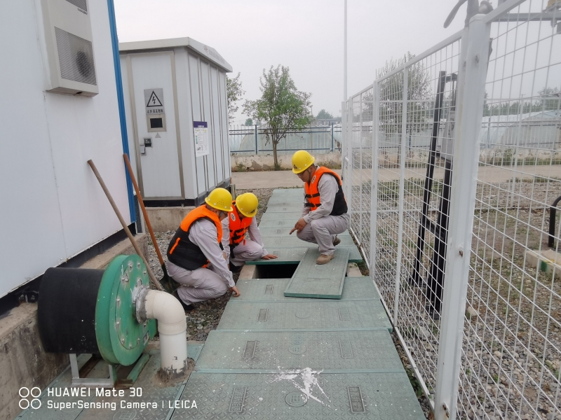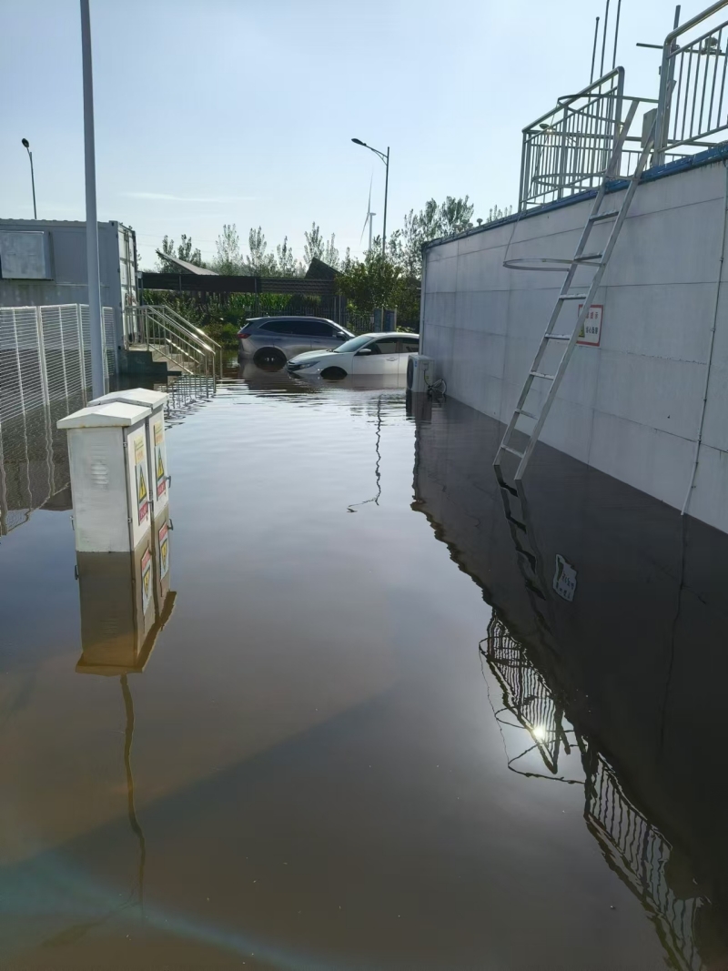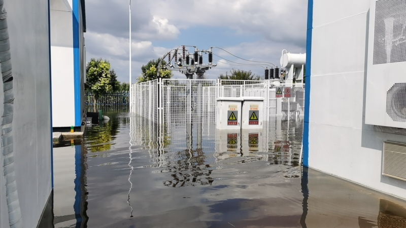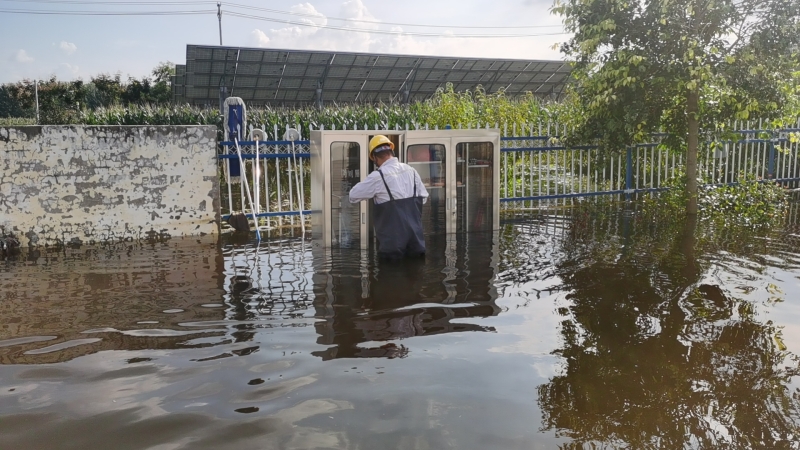 雨勢(shì)越來(lái)越猛,積水也越積越多,同時(shí)電站外面的積水也在向內(nèi)倒灌,遠(yuǎn)遠(yuǎn)望去,站內(nèi)的積水和周邊村莊田地連成一片汪洋。劉忠??粗e水高度的逐步上漲,先是淹到了腳踝,后來(lái)是空調(diào)外機(jī),眼瞅著已經(jīng)到了控制室和設(shè)備艙的臺(tái)階處,“于紀(jì)瑤,你跟我一起去查看積水情況!”兩人合力將地板掀開(kāi),看到下面已經(jīng)是積水?!?0公分,再升高10公分,設(shè)備就會(huì)產(chǎn)生巨大損壞,也會(huì)造成短路風(fēng)險(xiǎn)”劉忠保心里盤算著,“可是現(xiàn)在拉閘,發(fā)電量也會(huì)造成損失?!彼才烹娬救藛T白天全員在崗、夜間輪換值班,通過(guò)24小時(shí)不間斷值守對(duì)站內(nèi)重要設(shè)施進(jìn)行高頻率水位監(jiān)視,密切關(guān)注電纜溝水位與高壓開(kāi)關(guān)柜底部距離、接地變附近水位以及一次、二次室內(nèi)部濕度情況,力爭(zhēng)撐到最后的安全線再拉閘,將損失降到最低。