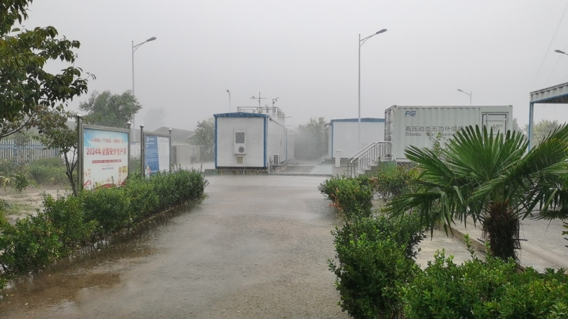 狂風(fēng)暴雨自9月17日12點(diǎn)來(lái)襲,由于碭山鑫能電站所處地勢(shì)低洼,很快形成積水。電站人員首先切斷了電動(dòng)門、生活水泵、電纜溝風(fēng)機(jī)等設(shè)備電源,防止因進(jìn)水短路可能引發(fā)的安全事故;將400V低壓ATS電源由常用模式切換至備用模式,并將35KV站用接地變514開(kāi)關(guān)由運(yùn)行轉(zhuǎn)冷備用,防止因水位上升對(duì)設(shè)備的影響。