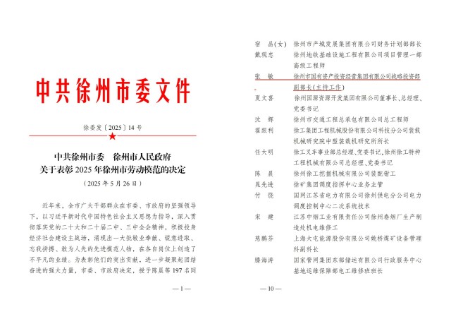 2025年5月28日,徐州市勞動模范表彰大會召開,徐州國投集團戰(zhàn)略投資部副部長(主持工作)張敏榮獲“徐州市勞動模范”稱號!