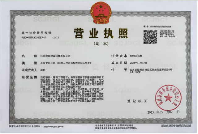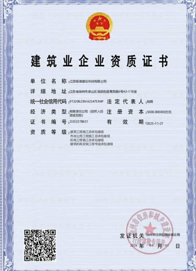 江蘇觀泰建設(shè)科技有限公司(以下簡(jiǎn)稱“觀泰公司”)是作為徐州市屬國(guó)企重點(diǎn)培育的現(xiàn)代建設(shè)服務(wù)商,成立于2020年11月,注冊(cè)資本5000萬(wàn)元,隸屬于徐州市國(guó)有資產(chǎn)投資經(jīng)營(yíng)集團(tuán),是徐州市環(huán)投能源科技有限公司的全資子公司。公司立足“科技賦能、品質(zhì)筑基”發(fā)展理念,持有建筑工程、市政公用工程施工總承包三級(jí)、機(jī)電工程等多項(xiàng)專業(yè)資質(zhì),致力于為客戶創(chuàng)造顯著的經(jīng)濟(jì)和社會(huì)效益,并得到了客戶的高度認(rèn)可,現(xiàn)已形成覆蓋房建、市政、機(jī)電、智能化工程的全產(chǎn)業(yè)鏈服務(wù)能力。
