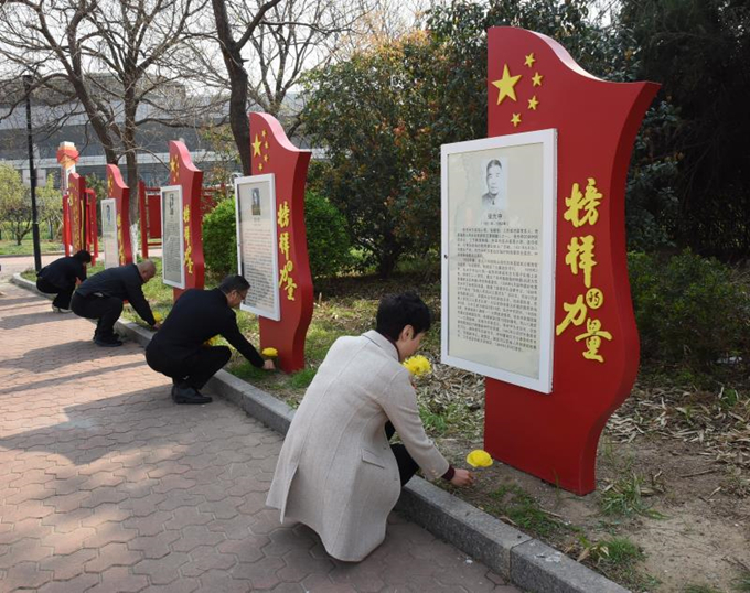 4月3日上午9時許,全體參與人員在會議室集中,利用彩紙、鐵絲等簡單的材料親自動手制作絹花,只見大家有的折紙、有的剪裁,寧靜而肅穆的制作,表達著我們對英雄發(fā)自肺腑的哀思和敬意。制作完成后,大家來到黨建文化園《榜樣的力量》專題區(qū),手捧花束依次排開,向革命先輩深深鞠躬并默哀,將親手制作的絹花整齊擺放在展板前。隨后,機關(guān)支部黨員代表就榜樣專題事跡向大家做了分享交流,感悟他們?yōu)榱斯伯a(chǎn)主義信仰英勇獻身的光輝事跡。最后,大家來到黨建園的宣誓區(qū),舉起右手,莊嚴(yán)宣誓,重溫入黨誓詞、重悟入黨初心?;顒咏Y(jié)束后,大家紛紛駐足在園區(qū)的不同專欄,認真瀏覽、細細品讀,久久不舍離去。